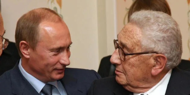 ロシア連邦モスクワ:ロシアのウラジミール・プーチン大統領(左)は、2007年7月13日、モスクワ郊外のノヴォ・オガリョヴォ公邸で行われたロシア・米国間の公的作業グループ「ロシア・米国:未来を見つめて」の会合で、ヘンリー・キッシンジャー元米国務長官(右)と握手している。ウラジミール・プーチン大統領は、ロシア・米国関係は両国の国民の利益を重視すべきであり、各国の現在の政治動向に左右されるべきではないと述べた。AFP PHOTO/ POOL/ SERGEI CHIRIKOV(写真提供:SERGEI CHIRIKOV/AFP/Getty Images)